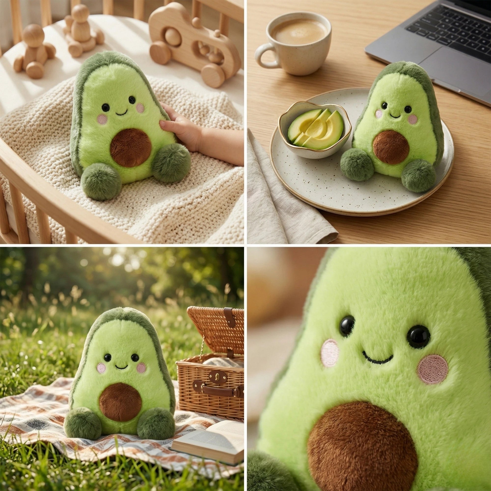 Aurora Palm Pals: Avocado pluș, 13 cm este o jucărie de pluș simpatică și originală, creată pentru a încăpea perfect în palmă, având un design vesel inspirat de forma unui avocado. Detaliile precum sâmburele stilizat și expresia prietenoasă îi oferă un aspect jucăuș și diferit față de plușurile clasice.